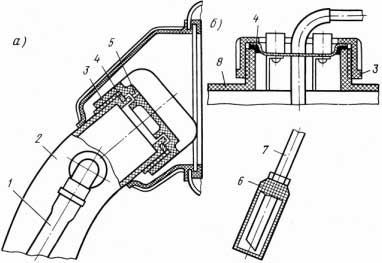 Рис. 3. Заливна горловина (а) та забірник палива (б) (АЗЛК): 1 — повітряний шланг; 2 — заливна горловина; 3 — різьбова пробка; 4 — гумова прокладка; 5 — дренажний отвір; 6 — фільтр забірника; 7 — забірна трубка; 8— бак. У деяких ДВЗ встановлено сепаратор (рис. 4), який служить для конденсації парів бензину. Пари поступають до нього шлангом 4, конденсуються та зливаються у бак тим само шлангом. Шланг 3 (рис. 4) з клапаном подвійної дії поєднує бак з атмосферою та підтримує постійний тиск у баці по мірі витрати палива. При заливанні палива повітря з баку відводиться шлангом 5. Зливним шлангом 16 забезпечується безперервна циркуляція палива, що запобігає утворенню парових пробок та припиненню подачі палива. Іноді підтримування постійного тиску здійснюється отвором у заливній пробці (рис. 3, а) або установленням у пробці повітряного та парового клапанів, аналогічно відповідним клапанам пробки радіатора системи охолодження.
