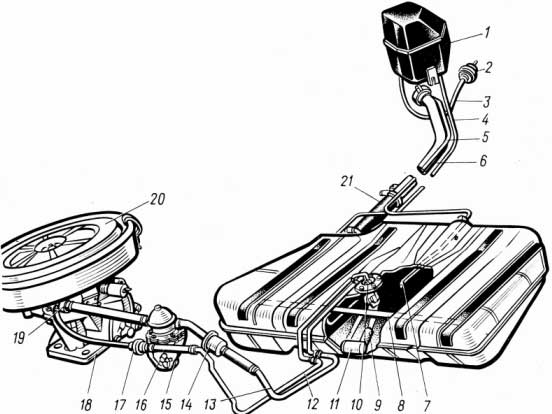 Рис. 4. Система живлення з сепаратором (ВАЗ-2108): 1 — сепаратор; 2 — клапан двобічної дії; 3, 4 — шланги сепаратора; 5 — повітрявідвідний шланг; 6 — заливна горловина; 7 — наконечник повітрявідвідного шланга; 8 — дренажна трубка; 9 — сітчастий фільтр паливозабірної трубки; 10 — реостатний датчик покажчика рівня палива; 11 — поплавок; 12 — магістраль зливу палива; 13 — магістраль подавання палива; 14 — фільтр тонкого очищення; 15 — паливний насос; 16 — зливний шланг; 17 — зворотний клапан; 18 — карбюратор; 19 — штуцер; 20 — повітряочищувач; 21 — шланг заливної горловини Паливний насос призначено для подачі палива з бака до карбюратора. На ДВЗ найчастіше встановлюють насоси діафрагмового типу (рис. 5) з приводом від ексцентрика, що звичайно розташовано на розподільному валу.