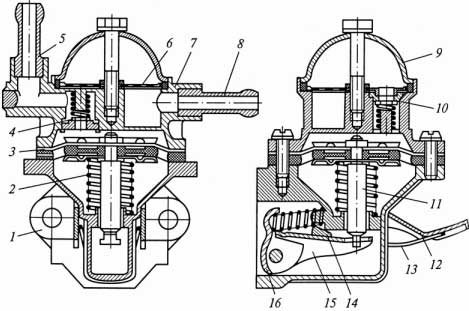 Рис. 5. Паливний насос: 1, 7 — корпус; 2 — пружина штока; 3 — блок діафрагм; 4 — напірний клапан; 5 — напірний патрубок; 6 — сітчастий фільтр; 8 — усмоктувальний патрубок; 9 — кришка; 10 — усмоктувальний клапан; 11 — шток; 12 — важіль ручного підкачування; 13 — пружина важеля ручного підкачування; 14 — ексцентрик важеля ручного підкачування; 15— балансир; 16 — важіль привода насоса Паливні фільтри бувають різних типів. У деяких конструкціях (ДВЗ вантажних автомобілів) перед паливним насосом встановлюють фільтр-відстійник грубого очищення щілинного або сітчастого типу (рис. 6). Фільтри тонкого очищення (рис. 7) встановлюють після паливного насоса. Їх виконують нерозбірними (змінними) з пористим паперовим або керамічним фільтроелементом або розбірними — з металевим сітчастим фільтроелементом.
