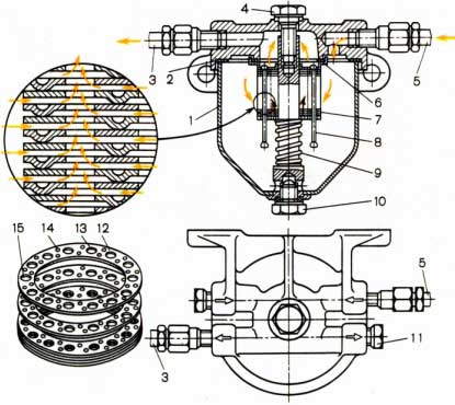 Рис. 6. Паливний фільтр-відстійник грубого очищення щілинного типу: 1 — корпус; 2 — прокладка; 3 — паливопровід до насоса; 4 — болт кришки; 5 — паливопровід від бака; 6 — прокладка фільтроелемента; 7 — фільтроелемент; 8 — стійка фільтроелемента; 9 — пружина; 10 — пробка зливального отвору; 11 — заглушка; 12 — пластина фільтроелемента; 13 — отвори для проходу палива; 14 — виступи на пластині; 15 — отвори для стійок