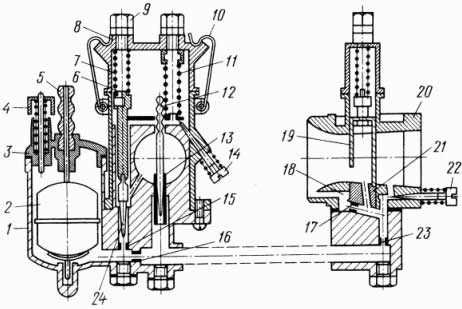Рис. 29. Карбюратор К-36: 1 — поплавцева камера; 2 — поплавець; 3 — кришка; 4 — утоплювач поплавця; 5 — штуцер; 6 — паливний коректор головної дозувальної системи; 7, 11 — пружина; 8 — кришка змішувальної камери; 9 — штуцер троса паливного коректора; 10 — засувка; 12 — дозувальна голка; 13 — розпилювач; 14 — гвинт регулювання підйому дроселя; 15 — жиклер паливного коректора; 16 — головний жиклер; 17 — повітряний жиклер; 18 — забірний повітряний карман холостого ходу; 19 — дросельна заслінка; 20 — змішувальна камера; 21 — канал холостого ходу; 22 — гвинт регулювання холостого ходу; 23 — жиклер холостого ходу; 24 — дозувальна голка паливного коректора