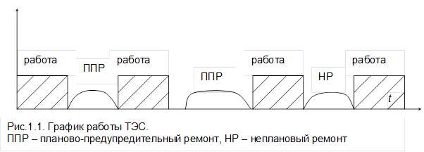 Лекция 2. ОТКАЗЫ ЭНЕРГЕТИЧЕСКОЙ УСТАНОВКИ Одним из основных понятий теории надежности является понятие работоспособного состояния установки и отказа работы установки. По ГОСТ Главная цель работы энергетической установки состоит в обеспечении потребителей электрической и тепловой энергией с заданными параметрами в требуемом количестве согласно диспетчерского графика нагрузок. При проектировании энергетической установки состав входящего в нее оборудования выбирается таким образом, чтобы в целом при заданном качестве топлива и определенных параметрах внешней среды установка развивала бы заданную мощность. Эта мощность или производительность называется номинальной. Сумма номинальных мощностей установленных на электростанции турбогенераторов называется установленной мощностью электростанции. При максимальном спросе на электроэнергию, а также в случае вынужденного останова других агрегатов на электростанции и возникающем при этом дефиците электроэнергии в некоторых случаях допускаются кратковременные перегрузки котлов и турбин выше номинальной мощности. Допустимый уровень перегрузок называется максимальной мощностью. Величина и максимальная продолжительность допустимой перегрузки определяются экспериментально и согласовываются с заводами-изготовителями оборудования. В реальных условиях эксплуатации энергетических установок возможно ограничение их нагрузки ниже номинальной из-за изменения качества топлива, дефектов оборудования, изменения внешних условий. Значение фактической мощности, которую можно использовать в данный момент времени, называется располагаемой мощностью. Тепловые энергетические установки допускают снижение производительности только до определенного предела, ниже которого отдельные агрегаты установки стабильно работать не могут. Эта мощность называется минимально допустимой мощностью. Она также определяется в результате испытаний и согласовывается с заводами-изготовителями. Графики нагрузок электрической и тепловой энергии, формируемые потребителями, существенным образом изменяются в зависимости от времени суток, дней недели, месяцев. По электростанциям нагрузки распределяются диспетчерскими службами в зависимости от требуемой мощности в системе, располагаемой мощности отдельных установок электростанций и их экономичности. Согласно ПТЭ, оборудование энергетических установок и сетей, принятых в эксплуатацию, должно находиться в одном из четырех оперативных состояний: Ø работа; Ø резерв; Ø ремонт; Ø консервация. Вывод в ремонт или постановка на консервацию оформляются оперативной заявкой, подписанной главным инженером и поданной в диспетчерскую службу энергосистемы. В случае, если оборудование требуется отключить немедленно, то заявка не оформляется, но в диспетчерскую службу посылается оперативное извещение о причинах отключения и предполагаемой продолжительности ремонта поврежденного узла. Таким образом, если соответствующие заявки не были оформлены, то предполагается, что оборудование находится в работоспособном состоянии и может нести нагрузку в пределах от минимально допустимой до максимальной. Значения этих мощностей зафиксированы в соответствующих документах электростанции и диспетчерских службах энергосистемы и министерства. По опреде