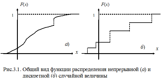 Это означает, что случайная величина Х может принимать значение График функции распределения F (x) в общем случае представляет собой график неубывающей функции, значения которой начинаются от 0 и доходят до 1, причем в отдельных точках функция может иметь скачки, то есть разрывы. Общий вид функции распределения показан на рис.3.1. Функция распределения любой дискретной случайной величины всегда есть разрывная ступенчатая функция, скачки которой всегда происходят в точках, соответствующих возможным значениям случайной величины, и равны вероятностям этих значений. Сумма всех скачков равна единице. По мере увеличения числа возможных значений и уменьшения интервалов между ними число скачков становится больше, а сами скачки – меньше; ступенчатая кривая становится более плавной. Случайная дискретная величина приближается к непрерывной, а ее функция распределения – к непрерывной функции.