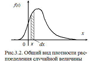 Функция f (x) характеризует плотность, с которой распределены значения случайной величины в данной точке. Эта функция называется плотностью распределения случайной величины Х. Ее также называют плотностью вероятности или дифференциальной функцией распределения. Кривая, изображающая плотность распределения случайной величины, называется кривой распределения. Вид кривой распределения изображен на рис.3.2.