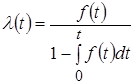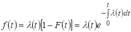 Геометрически основные свойства плотность означают, что вся кривая плотности распределения лежит не ниже оси абсцисс и полная площадь под кривой равна единице. Функция распределения, как и вероятность, есть величина безразмерная. Размерность плотности распределения обратна размерности случайной величины. В теории вероятностей для расчета процессов используются две основные аремы: Теорема сложения вероятностей: Вероятность суммы двух несовместных событий равна сумме вероятностей этих событий. Теорема умножения вероятностей: Вероятность произведения двух событий равна произведению вероятности одного на условную вероятность другого, вычисленную при условии, что первое событие произошло. Если события независимые, то вероятность их совместного появления равна произведению вероятностей этих событий. Плотность вероятности f (x) характеризует распределение вероятности значений случайной величины x до получения дополнительной информации о поведении этой величины и поэтому называется иногда безусловной плотностью вероятности f (x). Допустим, что в качестве случайной величины рассматриваем появление отказа оборудования после продолжительности работы t. Распределение этой вероятности имеет безусловную плотность f (x). Далее наблюдаем за оборудованием в течение времени от t =0 до t = t 1 и видим, что за этот период отказы не наблюдались. Вероятность появления отказа в момент времени t 1 при условии, что в течение периода от t =0 до t = t 1 отказы не появятся, будет иной, чем вероятность появления отказа в момент времени t =0, когда информация о поведении оборудования в течение периода от t =0 до t = t 1 отсутствует. Безотказная работа оборудования в течение времени t 1 и появление отказа в момент t 1 есть два зависимых события. В теории надежности для расчета подобных явлений используется еще одна характеристика непрерывной случайной величины l(t), представляющая собой условную плотность вероятности того, что отказ произойдет в малом интервале времени [ t, t + dt ], если известно, что ранее отказа не наблюдалось. Предположим, что закон распределения случайной величины – время появления отказа оборудования – описывается функцией распределения F (t) и плотностью вероятности f (t). По определению, значение F (t) равно вероятности того, что отказ оборудования появится в промежутке времени [0, t ], а вероятность появления отказа в течение малого промежутка времени [ t, t +d t ] равна f (t)d t. Тогда вероятность безотказной работы на интервале [0, t ] будет равна 1- F (t), а вероятность появления отказа на интервале [ t, t +d t ] при условии, что до этого момента отказов не было, равна l(t)d t. Рассматривая появление отказа на интервале времени [ t, t +d t ] как два последовательных события: отсутствие отказов до момента t и наступление отказа на интервале