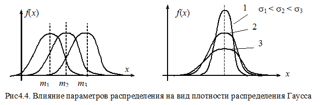 Параметрами распределения являются коэффициенты m и s. Величина m здесь соответствует математическому ожиданию случайной величины; s - среднее квадратичное отклонение величины х. Если изменить величину m, то кривая распределения будет смещаться вдоль оси абсцисс, не меняя своей формы. Центр рассеивания характеризует положение распределения на оси абсцисс.