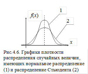 Закон определен для случайной величины x > 0. График плотности распределения показан на рис. 4.5. Это распределение позволяет описать распределение случайной величины, имеющую положительную асимметрию. Нормальное распределение хорошо согласуется с опытными данными, когда количество измерений достаточно велико. При малом количестве измерений более адекватным является распределение Стьюдента.. В качестве параметра распределения используется величина