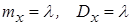 Параметром распределения является величина l > 0. Математическое ожидание и дисперсия равны: