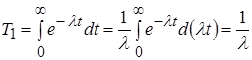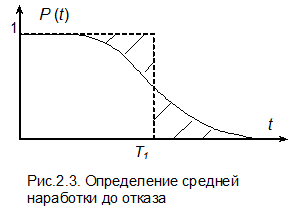 На рис.5.3. показана геометрическая интерпретация средней наработки до отказа. Величина T 1 есть такое значение t, при котором площадь прямоугольника с высотой 1 и основанием T 1 равна площади под кривой закона надежности. Для этого заштрихованные площади должны совпадать. В том случае, если используется экспоненциальный закон надежности при l = const, значение Т 1 определяется из выражения