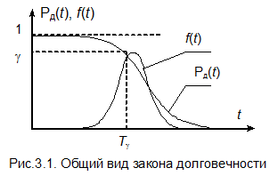 Закон долговечности объекта определяет вероятность P д(t) того, что предельное состояние объекта наступит не ранее момента t. По определению закон долговечности зависит от функции распределения случайной величины t д, соответствующей ресурсу или сроку службы объекта. Общий вид закона долговечности показан на рис.6.2. По оси абсцисс откладывается время достижения предельного состояния (ресурс или срок службы), по оси ординат вероятность возможности эксплуатации объекта. Очевидно, что Для невосстанавливаемых объектов, которые после первого отказа переходят в предельное состояние, закон долговечности совпадает с законом надежности, Многие виды энергетического оборудования рассчитываются на срок службы около 25-30 лет. Так как ресурс оборудования Tр и срок службы Tс зависят от ауния многих факторов, то можно ожидать, что величина