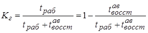 Это комплексный показатель надежности, характеризующий готовность объекта к работе в интервале времени между плановыми остановами объекта, в течение которых применение объекта по назначению не предусматривается, например, остановами объекта на плановый ремонт, модернизацию, вывод в консервацию. Коэффициент готовности представляет собой вероятность, что объект окажется в работоспособном состоянии в произвольный момент времени, кроме планируемых периодов, в течение которых применение объекта не предусматривается. Коэффициент готовности рассчитывается по формуле