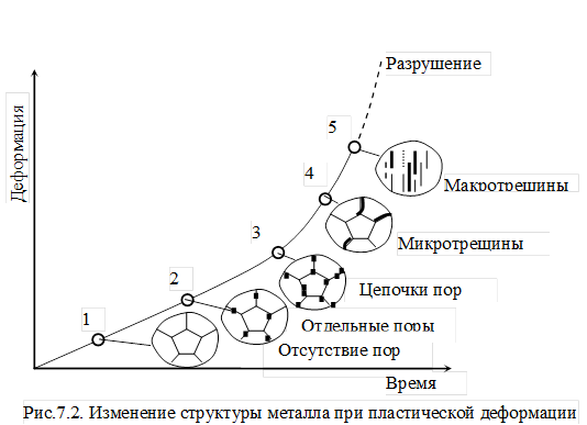 Зарождение и развитие несплошностей начинается на границах зерен. Первые трещины зарождаются всегда с наружной поверхности детали. Характер распределения микроповреждений металла зависит от растягивающего напряжения. При больших напряжениях микроповреждения локализуются вблизи поверхности разрыва, при малых напряжениях – распределяются равномерно по длине образца. На начальной стадии появляются отдельные поры (вид 2), с увеличением пластической деформации количество пор увеличивается, отдельные поры объединяются в цепочки (вид 3). В дальнейшем цепочки пор вырастают до микротрещин, которые охватывают обширные области материала (вид 4). В процессе деформации возникает несколько параллельных трещин (вид 5), которые развиваются внутрь поперечного сечения до тех пор, пока дальнейшее повреждение не сконцентрируется на одной магистральной трещине. По этой трещине и происходит разрушение детали.