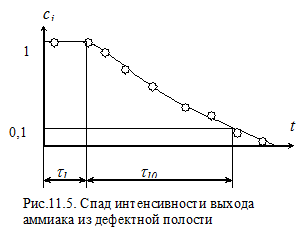 где d1, di – ширина портретов трещины на первом этапе испарения и при последующих (i -ых) измерениях; t 1, ti - время экспозиции снимков; Ti – время выдержки от начала испарения аммиака из дефекта до момента съемки портрета.