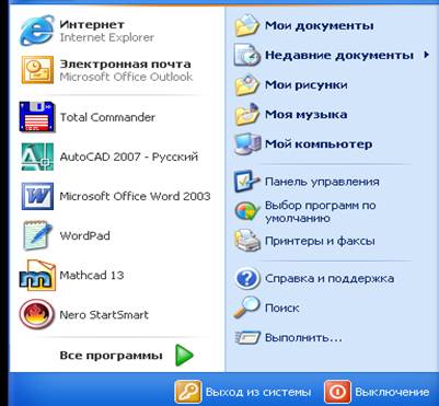 Головне меню WINDOWS Головне меню (рис. 2.3) – це перелік програм і функцій, що може призначатися для швидкого доступу до всіх ресурсів ПК. Головне меню дає змогу виконувати більшість завдань, пов’язаних з роботою операційної системи: ● запускати програму; ● відкривати найбільш уживані папки користувача; ● відкривати документи, з якими користувач працював останнім часом; ● проводити пошук даних; ● отримувати довідкову інформацію; ● проводити настроювання системи; Головне меню відкривають за допомогою кнопки Пуск або натисканням клавіші У верхній частині меню зазначається ім’я користувача, який працює в цей момент на комп’ютері. Поряд з ім’ям розміщено малюнок, пов’язаний з цим користувачем. Центральна частина меню розділена на дві колонки. Ліворуч розміщено команди, призначені для запуску постійно діючих програм. Праворуч у центральній частині розташовано команди, яки дозволяють переглядати вмісту важливих папок комп’ютера.