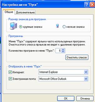 Команди, розташовані нижче, призначені для запуску програм, з якими останнім часом працював користувач. Як тільки ви запустите будь-яку програму, відповідна команда з’явиться саме в цій частині головного меню. При цьому програми, що давно не запускались, можуть бути вилучені з меню. Нижче розташовано команду Все программы, яка відкриває доступ до програм, встановлених на ПК. У нижній частині меню містяться команди для завершення роботи WINDOWS. За їхньою допомогою можна призупинити роботу комп’ютера, перезавантажити його або вимикнути (Выключение). Крім того, можна ввійти в систему під іншим іменем (Выход из системы). Налагодження головного меню здійснюється з діалогового вікна Настройка меню «Пуск» (рис. 2.4), що викликається командою Пуск→Панель управления→Панель задач и меню «Пуск», кнопка Настроить. Використовуючи це діалогове вікно, можна настроїти: ● вигляд значків, що відображатимуться в меню: Крупные значки або Мелкие значки; ● задати кількість програм, що відображуються в списку найчастіше вживаних програм за допомогою кнопки Количество программ в меню «Пуск». ● вилучення ярликів із списку програм, які найчастіше використовуються кнопкою Очистить список. При цьому, як правило, програми з комп’ютеру не видаляються;