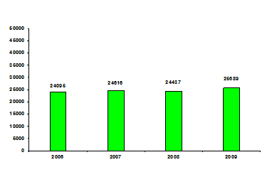 На территории Беларуси расположено значительное количество исторических городов – Полоцк, Новогрудок, Туров, Гродно, Несвиж и другие. Во многих городах сохранились храмы и монастыри, дворцы и замки, ценные архитектурные, исторические и культурные памятники. В список Всемирного наследия ЮНЕСКО включены следующие туристические объекты Республики Беларусь: Замковый комплекс «Мир» в г.п.Мир, Гродненская обл. (2000 г.); Национальный парк «Беловежская пуща» (1992г.); Архитектурно-культурный комплекс бывшая резиденция Радзивилов в г.Несвиж (2005 г.); Дуга Струве (топографический) (2005 г.). В Республике Беларусь имеется большое количество памятников, представляющих историко-культурные ценности: памятники архитектуры (1597); памятники истории (1131); памятники искусства (122); памятники археологии (1834). Разнообразен растительный и животный мир, много памятников природы, природных лечебных ресурсов, охотничьих и рыболовных угодий. В республике 4 национальных парка, Березинский биосферный заповедник, 97 заказников, в том числе 7 – международного значения, более 10 тысяч озер, около 20 тысяч рек. В 2009 году туристической деятельностью в Беларуси занимались более 700 организаций. Только в Минске их насчитывается 326. Списочная численность работников, занятых оказанием туристических услуг, составила 2 тысячи и возросла по сравнению с 2008 годом на 3,5 %. В настоящее время в республике функционирует более 330 средств размещения (размещено более 1,5 млн. чел.): гостиницы – 274; гостиничные комплексы – 23; мотели – 1; кемпинги – 4; другие виды – 29; 102 санатория на 24 тысячи мест. Кроме того, ежегодно открывается 5 – 10 новых гостиниц. К 2014 году, когда Беларусь будет принимать чемпионат мира по хоккею, количество мест размещения в Минске увеличится в 2 – 3 раза. На рис. 6.2 и 6.3 представлены данные по единовременной вместимости и численности обслуженных лиц в средствах размещения Республики Беларусь.
