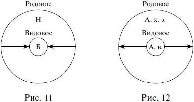 Обобщение понятия – это логическая операция перехода от видового понятия к родовому с помощью исключения из его содержания какого-либо признака (или нескольких признаков). Содержание понятия, лишенное каких-то признаков, уменьшается, но при этом автоматически увеличивается объем понятия, которое из видового становится родовым или обобщается. Например, если от содержания понятия биология (Б) отбросить признак изучать различные формы жизни, то оно превратится в понятие наука (Н), которое будет родовым по отношению к исходному видовому понятию биология (рис. 11). Если от содержания понятия атом водорода (А. в.) отбросить признак иметь один электрон, то оно превратится в понятие атом химического элемента (А. х. э.), которое будет родовым по отношению к исходному видовому понятию атом водорода (рис. 12).