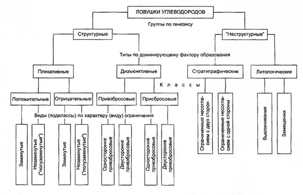 Подводя итог вышесказанному в подразделе 4.1.1 и не добавляя каких-либо новых определений, следует: 1. Объекты поиска - это всевозможные ловушки углеводородов, которые являются составной частью природных резервуаров. 2. Объекты оценки и последующей разведки – залежи, наличие которых в ловушках, расположенных в природных резервуарах, доказывается путем проведения поисковых работ. Изучением и классификацией объектов поиска, оценки и разведки углеводородного сырья в разные годы занимались такие известные отечественные нефтяники, как: И. М. Губкин, И. А. Брод, М. Ф. Мирчинк, А. А. Еременко, А. А. Трофимук, В. Е. Хаин, А. А. Бакиров, И. В. Высоцкий, К. С. Маслов, С. В. Гольдин, Ю. Г. Эрвье, В. Ф. Никанов, М. В. Абрамович, А. М. Волков, Н. А. Гольдин, Ф. К. Салманов, В. Б. Оленин, И. И. Нестеров, Ю. Н. Карогодин и др. Следует отметить, что и в настоящее время идет работа над развитием этих классификационных схем по мере получения новой информации по конкретным объектам и вследствие смены основной парадигмы нафтидогенеза, господствующей в ХХ веке. Классификация ловушек углеводородов и резервуаров в отраслевой литературе обычно дается по морфогенетическим критериям, что соответствует в конечном итоге их генезису. В качестве примера в настоящем подразделе приводится такая классификация, разработанная для Западно-Сибирской НГП (см. рис.4.2).