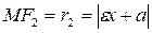 Гипербола пересекает ось Ox в точках А 1 (-а;0), А 2 (а;0) – вершинах гиперболы и не пересекает ось Oy. А 1 А 2 =2а – действительная ось, а – действительная полуось; В 1 В 2= 2b – мнимая ось, b – мнимая полуось; Прямоугольник со сторонами 2а и 2b – основной прямоугольник гиперболы. В 1 (0;-b), В 2 (0;-b) – точки пересечения основного прямоугольника с Oy. Эксцентриситет гиперболы Чем больше e, тем больше гипербола вытянута вдоль оси Ox. Если основной прямоугольник – квадрат, т.е. a=b (действительная и мнимая оси гиперболы равны), то гипербола равносторонняя и задана уравнением Отрезки Прямые Директрисы расположены внутри основного прямоугольника. Прямые Свойства гиперболы 1° (56) 2° Гипербола симметрична относительно начала координат и осей Ox, Oy. Точка О – центр гиперболы. 3° Директориальное свойство гиперболы: Для любой точки М, принадлежащей гиперболе, справедливо отношение: Уравнение (55) определяет гиперболу, у которой действительная ось совпадает с осью Ox и
