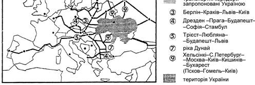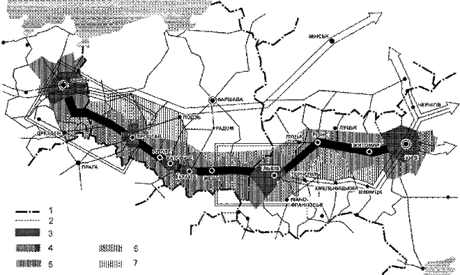 Рис. 2.3. Структурно-планувальна модель транспортного коридору Берлін – Київ (за Ю. Білоконем)