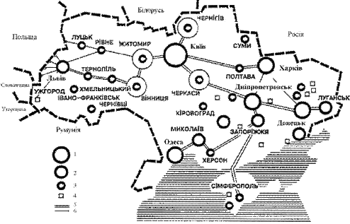 Рис. 2.7. Україна. Міжобласні системи розселення: 1 – центральна; 2 – західна; 3 – східна; 4 – північно-східна; 5 – південно-східна; 6 – південна
