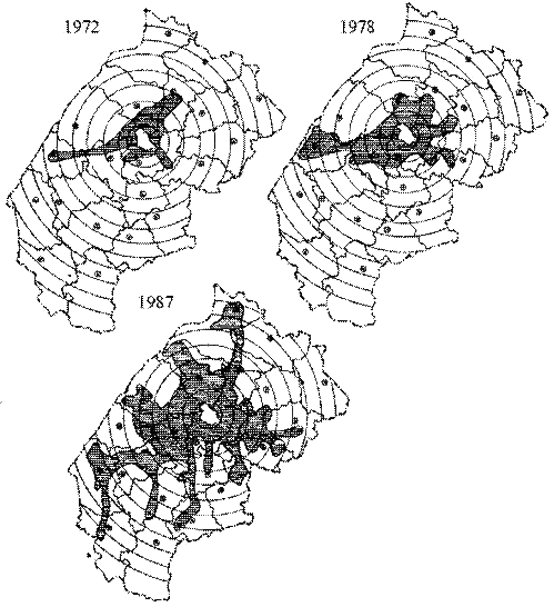 Рис. 2.10. Львівська область. Еволюція ареалу маятникової міграції Львівської агломерації у 1972–1987 рр. Кола проведені через 10 км (за Б. Черкесом)