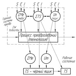 I. TS как элемент системы преобразований. Для удовлетворения своих потребностей человек находит в природе лишь некоторые полноценные, не требующие изменения средства. В большинстве случаев он вынужден на эти средства (массу) воздействовать многочисленными технологическими способами: изменять, комбинировать, резать, плавить, варить, разрушать, преображать энергию и др. Процессы такого рода называются преобразованиями. Существуют модели системы преобразований вытекающие из следующих соображений: – желаемые преобразования достигаются целенаправленным воздействиями материального (S), энергетического (Е), информационного (I) типов. – все воздействия при любом преобразовании осуществляются людьми (∑Ме), техническими системами и окружением (Um). Получение модели технической системы (TS-черный ящик) из модели системы преобразований, представлена на рис.1.5.