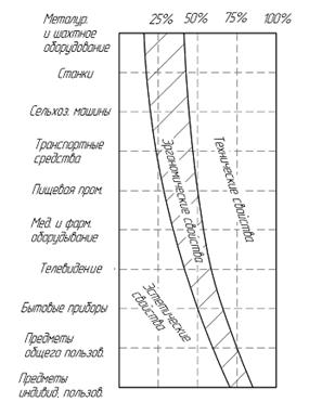 На практике общепризнано, что нижние уровни технических систем находят более универсальное применение. Классификация по типу производства. 1. TS единичного и мелкосерийного производства. В этом случае конструкторские и подготовительные работы необходимо приспособить к нуждам поштучного производства, в условиях которого стоимость каждой изготовленной технической системы увеличивается. Не исключено, что в условиях единичного производства необходимая функция технической системы вообще не будет достигнута, поскольку при изготовлении крупных технических систем приходится работать без прототипа. Поэтому эта категория систем предъявляет высокие требования к конструкторской документации и оснащению производства современными технологическими комплексами с ЧПУ. 2. TS серийного и массового производства. Эти системы в целом лучше проработаны с точки зрения производства. Из-за большого объема партий изделий доля конструкторских затрат по отношению к общим расходам невелика. Однако поскольку контролю подвергается, как правило, лишь небольшая часть изделий, то не исключены различные погрешности и дефекты. Только при осуществлении непрерывного контроля за всеми операциями или выпускаемыми деталями и изделиями в целом можно добиться стабильного качества при серийном и массовом производствах. Специалисту упомянутые категории систем интересны и в том плане, что они формируют основу для определения возможного качества изделий. Прослеживается четкая тенденция ко все большему использования унифицированных, серийно выпускаемых технических систем, особенно для выполнения различных функций низких уровней, например элементов соединения, измерения, регулирования, привода, распределения. С другой стороны, возрастает количество систем специального назначения. Современное производство не может обойтись без целого ряда вспомогательных средств, специализированных машин, автоматов и поточных линий, специального оборудования, т.е. без всего того, что обеспечивает выпуск дешевой унифицированной продукции в массовом количестве. III. Свойства TS. При рассмотрении TS по их свойствам анализ обычно начинают со слов „какая”, „какой” и т.п. (скорость, надежность, производительность, цена и т.п.). Наиболее предпочтительной является классификация свойств по потребности в конструкторской работе. Существует соотношение между техническими, эргономическими и эстетическими свойствами TS (рис. 1.6).