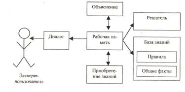 Рисунок 1.40 – Схема обобщенной экспертной системы База данных предназначена для хранения исходных и промежуточных данных решаемой в текущий момент задачи. Этот термин совпадает по названию, но не по смыслу с термином, используемым в информационно-поисковых системах и системах управления базами данных (СУБД) для обозначения всех данных (и в первую очередь не текущих, а долгосрочных, хранимых в системе). База знаний в ЭС предназначена для хранения долгосрочных данных, описывающих рассматриваемую область (а не текущих данных), и правил, описывающих целесообразные преобразования данных этой области. Решатель, используя исходные данные из РП и знания из БЗ, формирует такую последовательность правил, которые, будучи примененными к исходным данным, приводят к решению задачи. Компонент приобретения знаний автоматизирует процесс наполнения ЭС знаниями, осуществляемый пользователем-экспертом. Объяснительный компонент объясняет, как система получила решение задачи (или почему она не получила решения) и какие знания при этом она использовала, что облегчает эксперту тестирование системы и повышает доверие пользователя к полученному результату. Диалоговый компонент ориентирован на организацию дружелюбного общения со всеми категориями пользователей, как в ходе решения задач, так и приобретения знаний, объяснения результатов работы. ЭС работает в двух режимах, приобретения знаний и решения задач (называемыми также режимом консультации и режимом использования ЭС). Следует говорить о трех поколениях ЭС. К первому поколению следует отнести статические поверхностные ЭС, ко второму – статические глубинные ЭС (иногда ко второму поколению относят гибридные ЭС), а к третьему – динамические ЭС (вероятно, они, как правило, будут глубинными и гибридными). Самое главное различие ЭС от традиционных программ состоит в том, что ЭС манипулируют знаниями, в то время как обычные программы манипулируют данными. В современных ЭС чаще всего используются три самых важных метода представления знаний: правила (самый популярный), семантические сети и фреймы.