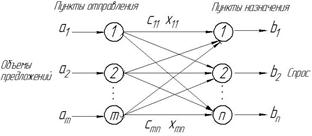 Пример Транспортная задача. Транспортные модели (задачи) – специальный класс задач линейного программирования. Эти модели часто описывают перемещение (перевозку) какого-либо товара из пункта отправления (исходный пункт, например место производства) в пункт назначения (склад, цех, грузохранилище). Назначение транспортной задачи – определение объемов перевозок из пунктов отправления в пункты назначения с минимальной суммарной стоимостью перевозок. При этом должны учитываться ограничения, накладываемые на объемы грузов, имеющихся в пунктах отправления (предложения), и ограничения, учитывающие потребность грузов в пунктах назначения (спрос). В транспортной модели предполагается, что стоимость перевозки по какому-либо маршруту прямо пропорциональна объему груза, перевозимого по этому маршруту. В общем случае транспортную модель можно применять для описания ситуаций, связанных с управлением запасами, управлением движением капиталов, составлением расписаний, назначением персонала и др. На рис. 2.3 показано представление транспортной задачи в виде сети с т пунктами отправления и п пунктами назначения, которые показаны в виде узлов сети. Дуги, соединяющие узлы сети, соответствуют маршрутам, связывающим пункты отправления и назначения. С дугой (i, j), соединяющей пункт отправления i с пунктом назначения j, соотносятся два вида данных: (1) стоимость сij перевозки единицы груза из пункта i в пункт j и (2) количество перевозимого груза хij. Объем грузов в пункте отправления i равен аi, а объем грузов в пункте назначения j – bj Задача состоит в определении неизвестных величин хij, минимизирующих суммарные транспортные расходы и удовлетворяющих ограничениям, накладываемым на объемы грузов в пунктах отправления (предложения) и пунктах назначения (спрос).