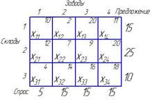 Алгоритм решения транспортной задачи повторяет основные шаги симплекс-метода. Однако для представления данных, вместо обычных симплекс-таблиц, используются транспортные таблицы со специальной структурой. Алгоритм решения транспортной задачи будет проиллюстрирован на следующем примере. Транспортная компания занимается перевозкой грузов от трех пунктов отправления к четырем пунктам назначения. На рис. 2.4 показаны возможности отгрузки (предложения) пунктов отправления (сладов) (в тоннах) и потребности (спрос) пунктов назначения (заводы) (также в тоннах), а также стоимость перевозки продукции одной машиной от складов к заводам. Стоимость перевозок сij приведена в сотнях гривен. В данной задаче требуется определить структуру перевозок между складами и заводами с минимальной стоимостью. Для этого необходимо найти объемы перевозок хij между i -м складом и j -м заводом.