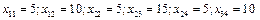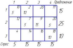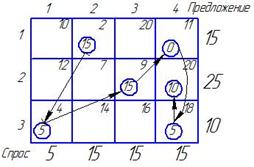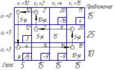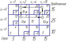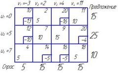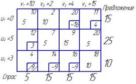 Рисунок 2.9 – Начальное базисное решение методом Определение вводимой переменной среди текущих небазисных (т.е. среди тех переменных, которые не входят в начальное базисное решение) основано на вычислении коэффициентов z - строки, соответствующих небазисным переменным, с использованием метода потенциалов. В методе потенциалов каждой строке i и каждому столбцу j транспортной таблицы ставятся в соответствие числа (потенциалы) иi и vj. Для каждой базисной переменной xij потенциалы иi и vj удовлетворяют уравнению