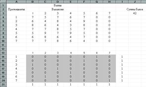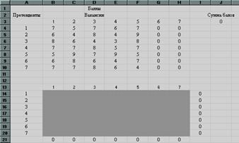 1) Ввод данных. Переносим данные задачи в EXCEL, при этом нужно ввести 2 столбца (6-ой и 7-ой) с нулевыми значениями для сбалансирования задачи. Результаты заполнения таблицы EXCEL можно увидеть на рис. 2.27: В ячейках B4: F10 введены результаты тестирования претендентов, а в ячейках G4: H10 введены нули, что соответствует фиктивным Ячейки B14: F20 являются изменяемыми ячейками для нашей процедуры. В ячейках B21: H21 находятся суммы значений соответствующих столбцов изменяемых ячеек. Так в ячейке B21 находится сумма ячеек B14: B20. Аналогично в ячейках: в С21 находится сумма ячеек С14: С20; в D21 находится сумма ячеек D14: D20; в E21 находится сумма ячеек E14: E20; в F21 находится сумма ячеек F14: F20. в G21 находится сумма ячеек G14: G20; в H21 находится сумма ячеек H14: H20.