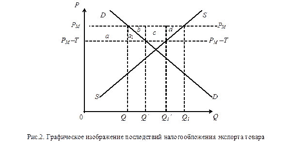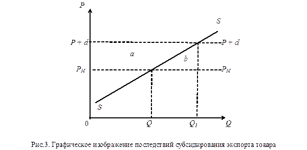 При этом у субъектов экономики образуются потери и дополнительные выгоды. В соответствии с неоклассической теорией, потребители товара несут потери, размер которых равен площади фигуры, расположенной между горизонтальными линиями РМ + Т и РМ и ограниченной слева осью ординат (0 Р), справа – кривой спроса (D). Эта площадь, как видно из графика, складывается из площади четырех фигур и равняется a + b + c + d. Национальные же производители получают дополнительные выгоды, размер которых равен площади a. Государство получает дополнительные налоги на сумму, равную площади с. В итоге объем дополнительных выгод производителей и государства меньше суммарных потерь потребителей: a + c < a + b + c + d, и чистые потери общества от введения налога на импорт составляют (b + d). Причем, как видно из рис. 1, чем выше ставка налога, тем больше чистые потери. 2) Неоклассическая трактовка последствий налогообложения экспорта. Аналогичные рассуждения используются неоклассиками для доказательства неэффективности использования налогов на экспорт товаров. Рассматривается ситуация аналогичная той, которая предполагалась в случае с налогообложением импорта. Она иллюстрируется графически. См. рис. 2. Налог на экспорт вводится в том случае, когда цена равновесия на внутреннем рынке ниже цены мирового рынка. До введения налога на экспорт, в условиях свободной торговли внутренняя цена товара устанавливается на уровне цены мирового рынка. При этом объем производства товара равен Q 1, объем потребления внутри страны – Q, объем экспорта –(Q 1 – Q). После введения налога на экспорт доход от продажи единицы товара у производителя сокращается на величину ставки налога Т. Для предприятий это равносильно тому, как если бы они продавали товар не по цене РМ, а по цене РМ – Т. В результате объем национального производства товара сокращается до величины Q 1΄, объем экспорта – до величины (Q 1΄– Q ΄), а внутрен В этом случае дополнительные выгоды образуются у потребителей, они равны сумме площадей (а + а 1); государство получает дополнительные налоги в объеме, количественно совпадающем с площадью с. Но производители несут потери, величина которых равняется сумме площадей: (a + а 1 + b + c + d) и превышает сумму выигрышей потребителей и государства (а + а 1 + с). Чистые потери общества в данном случае составят (b + d). Таким образом, с точки зрения неоклассики, и налогообложение экспорта экономически невыгодно для страны в целом. 3) Неоклассическая трактовка последствий субсидирования экспорта (замещения импорта). Субсидирование в той или ной форме экспорта или замещения импорта предпринимается в целях повышения конкурентоспособности национального производства. Его последствия иллюстрируются на рис. 3. До введения субсидии товар продавался по цене мирового рынка (РМ) в объеме Q. Установление субсидии на каждую единицу товара в размере d для предприятий равнозначно по своему действию повышению цены мирового рынка на ту же величину, т.е. до уровня РМ + d. В результате объем экспорта (замещения импорта) возрастает до Q 1. При этом у национальных производителей образуется выигрыш, равный площади а. Но затраты государства на выплату субсидий составят величину, соответствующую площади а + b. Иначе говоря, чистые издержки государства будут равны площади b.
