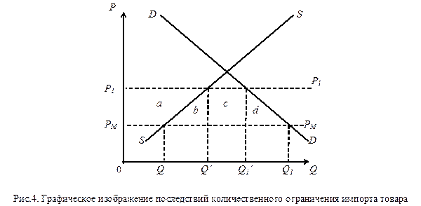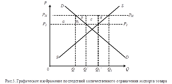 Аналогично обосновывается неэффективность государственных дотаций по импорту товаров. 4) Неоклассическая трактовка последствий количественного ограничения импорта. Количественное ограничение импорта товара используется, когда цена мирового рынка ниже цены равновесия на внутреннем рынке товара. Последствия такого метода государственного регулирования внешней торговли в неоклассике анализируется способом, аналогичным примененному в рассмотренных выше случаях. См. рис. 4. В условиях свободной торговли, до введения ограничений на импорт товара, цена на внутреннем рынке товара совпадала с его ценой на мировом рынке (РМ). Объем продаж товара на внутреннем рынке был равен Q 1, причем национальное производство давало Q, импорт составлял (Q 1 – Q). Введение количественного ограничения на импорт в размере импортной квоты, равной (Q 1΄– Q ΄), приводит к росту его цены до уровня Р 1. При этом национальное производство товара расширяется до величины Q ΄. Согласно неоклассики, в этом случае потери потребителей товара составят сумму площадей (a + b + c + d), а выигрыш национальных производителей – площадь a. Государство не получит дополнительных налогов, но у импортеров товара возникнет дополнительный доход, образующийся за счет разности цен внутреннего и мирового рынков, равный площади c. Здесь, как и в предыдущих случаях потери превосходят выигрыши на величину, не меньшую суммы площадей (b + d); т.е. и такой метод регулирования внешней торговли не выгоден, с точки зрения неоклассики, для общества в целом. Кроме того, неэффективность такого способа регулирования внешней торговли, по мнению неоклассиков, заключается и в том, что при его использовании национальные производители полностью отгораживают от иностранной конкуренции, поскольку цена внутреннего рынка товара и объем продажи на нем не зависят от изменения цены товара на мировом рынке. (Изменение последней влияет только на доходы импортеров). 5) Неоклассическая трактовка последствий количественного ограничения экспорта. Количественное ограничение экспорта применяется, когда цена равновесия на внутреннем рынке ниже цены мирового рынка и необходимо увеличить предложение и понизить цену товара на внутри страны. Неоклассическая трактовка последствий такого метода графически изображена на рис. 5.