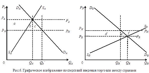 До введения ограничений экспорта, в условиях свободной торговли внутренняя цена товара устанавливается на уровне цены мирового рынка, объем производства равен Q 1, объем потребления внутри страны – Q, объем экспорта –(Q 1 – Q). После введения экспортной квоты, равной (Q 1΄– Q ΄), производство товара сокращается до величины Q 1΄, а его потребление внутри страны возрастает до Q ΄, цена товара на внутреннем рынке понижается до Р 1 при том, что на мировом рынке она остается равной Р М. В итоге выигрыш потребителей товара определяется площадью (а + а 1). Но производители несут потери, величина которых равняется сумме площадей: (a + а 1 + b + d) (доход от экспорта, равный площади с, у них сохраняется), что превышает сумму выигрышей потребителей на величину площади (b + d). Это означает неэффективность количественного ограничения экспорта товара. Таким образом, с точки зрения неоклассики, вмешательство государства во внешнюю торговлю ведет к чистым потерям для общества. Неоклассика разработала и подход к оценке выигрыша, который получают страны, ранее не связанные товарообменом, к торговле между собой. Он строится на следующей модели. Рассматриваются рынки некоторого товара в двух странах (например, в стране А и стране В) до введения торговли между ними. См. рис. 6. Для того, чтобы цены в этих странах были сопоставимы, они измеряются в меновой стоимости товара, т.е. в количестве других товаров, которое можно обменять на единицу данного товара.