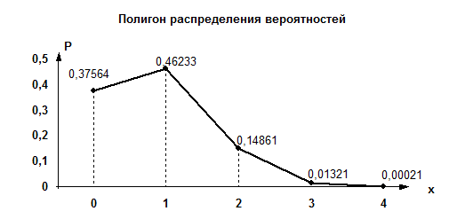 Произведем проверку. Так как все возможные значения случайной величины образуют полную группу событий, сумма их вероятностей должна быть равна 1. Проверка: 0,37564 + 0,46233 + 0,14861 + 0,01321 + 0,00021 = 1. График полученного распределения вероятностей дискретной случайной величины - полигон распределения вероятностей; изображенный на рис 4.8