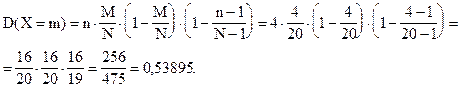 б) Найдем основные числовые характеристики распределения данной случайной величины. Можно рассчитать математическое ожидание, дисперсию и среднее квадратическое отклонение по общим для любой дискретной случайной величины формулам. Но математическое ожидание случайной величины, подчиняющейся гипергеометрическому распределению, может быть рассчитано по более простой формуле: