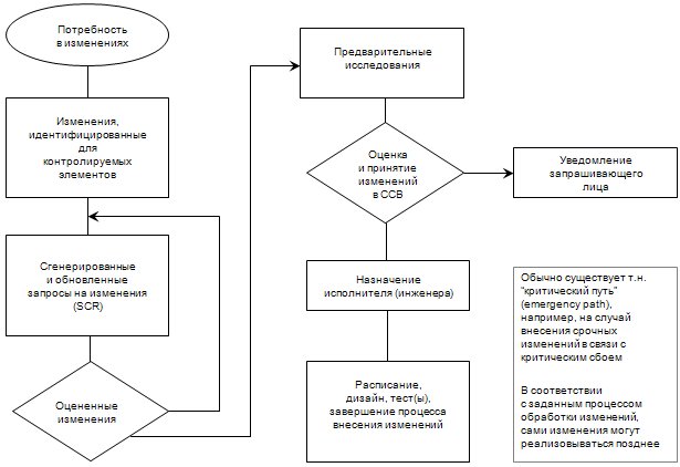 Рисунок 5. Поток процесса контроля изменений. [SWEBOK, 2004, с.7-7, рис. 5] Такой подход обеспечивает возможность отслеживания дефектов и сбора метрических показателей о деятельности по обработке и внесению изменений, с группировкой по типу изменений. Как только получен запрос на изменение (SCR), производится техническая оценка (включающая, а иногда и называемая анализом влияний – impact analysis) запрашиваемых изменений для определения масштабов модификаций, необходимых для удовлетворения параметров запрашиваемых изменений (достаточно часто, в результате такого анализа формулируются соответствующие требования, определяющие содержание необходимых работ). Четкое понимание связей между программными (и, возможно, аппаратными) элементами системы является важной составной частью данной задачи. Наконец, органы, обладающие полномочиями, соответствующими затрагиваемой базовой линии, элементам программной конфигурации и природе изменений, должны оценить технические и управленческие (организационные) аспекты внесения запрашиваемых изменений, а также принять, модифицировать, отклонить или отложить предлагаемые изменения. 3.1.1 Совет по конфигурационному контролю (Software Configuration Control Board) Полномочия по принятию или отклонению предлагаемых изменений обычно возлагаются на <организационную> сущность, называемую совет по конфигурационному контролю - Configuration Control Board (чаще звучит как совет по координации изменений - Change Control Board, CCB). В небольших проектах такие полномочия могут, в действительности, принадлежать лидеру или одному назначенному лицу из числа членов проектной команды. В общем случае может существовать несколько уровней полномочий в части принятия решений в отношении изменений, в зависимости от различных критериев, таких как критичность предлагаемых изменений, их приоритет, природа изменений (например, параметры бюджета или расписания) или текущая точка жизненного цикла. Решения о том, кто именно будет включен в CCB для данной системы (проекта) могут варьироваться, в зависимости от данных критериев. Однако, в CCB всегда должно присутствовать лицо, вовлеченное в организацию конфигурационного управления. В CCB входят все заинтересованные лица, чья роль соответствует уровню CCB. Когда содержание полномочий CCB охватывает только аспекты программного обеспечения, такой совет называется Software Configuration (Change) Control Board – SCCB. Деятельность CCB обычно является объектом аудита качества или оценки. Учитывая роль управления изменениями в конфигурационном управлении и реальные задачи CCB, более обоснованным выглядит использование именно названия Change Coordination & Control Board – в общем случае звучащий как совет по координации и контролю изменений. 3.1.2 Процесс обработки запросов на изменения (Software change request process) Эффективный процесс <обработки> запросов на изменения (SCR process) требует использования соответствующих средств поддержки и процедур <для данного вида деятельности>, от “бумажных” форм и документированных процедур (как последовательности действий или сценариев) до программных инструментов, позволяющих отсылать запросы на изменения, выполнять процесс обработки таких запросов (изменять их статус, комментировать, детализировать и т.п.), фиксировать решения, принятые CCB, а также генерировать отчетную информацию по процессу обработки запросов на изменения. Связь ме