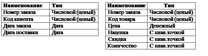 Примерный подход к реализации этих этапов рассматривается ниже. Анализируя предметную область, описанную данной информацией, выделим следующие объекты: · Заказы; · Клиент; · Товар. На основании информации об этих объектах спроектируем реляционную базу данных. Реляционная БД представляет собой совокупность связанных между собой таблиц (отношений). Каждая таблица обладает структурой, элементами которой являются перечень атрибутов и их типов. Для заданного перечня требований возможен следующий подход к разработке отношений. Основным отношением модели будет отношение сведений о заказах. Поскольку в заказ входят данные относящиеся как к заказу в целом так и к спецификации, данные которых связаны как один ко многим, информация заказа будет храниться в двух отношениях со следующей структурой.