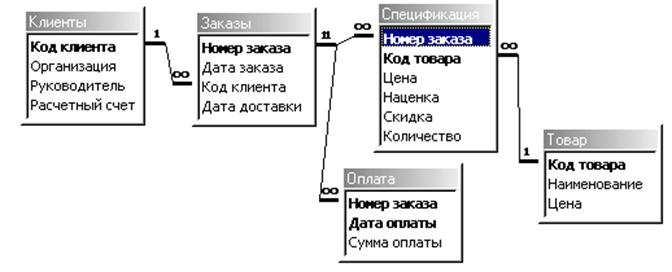 Все описанные выше таблицы связаны между собой по определенной схеме. Так отношение СПЕЦИФИКАЦИЯ дополняет ЗАКАЗ и связано с ним через атрибут Номер заказа. Причем эта связь один-ко-многим со стороны отношения ЗАКАЗ, так как каждой строке этого отношения соответствует 0,1 или несколько строк с таким же номером заказа в отношении СПЕЦИФИКАЦИЯ. В целом схема связей между отношениями в этой БД имеет вид: