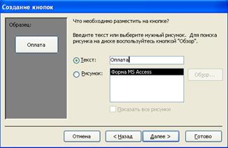 Следующим объектом, который нужно создать является кнопка «Оплата». Кнопка создается обычным путем. В появившейся серии окон нужно выбрать позиции, как показано на рисунках.