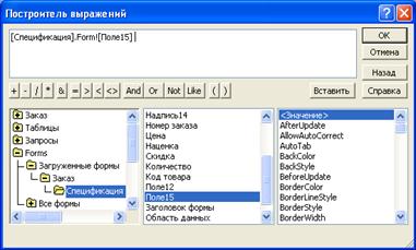И последним объектом, который необходимо создать в форме «Заказы», является поле с итоговой суммой по заказу. В подчиненной форме «Спецификация» такое поле было построено как скрытое (имя поля «Поле15»). Для того, чтобы показать значение этого поля в форме «Заказы», необходимо создать несвязное поле и в его свойстве «Данные» создать с помощью построителя выражений ссылку на соответствующее поле в форме «Спецификация» следующего вида: