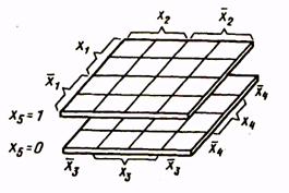 До сих пор рассматривались логические функции с числом аргументов до четырех. Представление функции и минимизация ее с помощью карт Вейча усложняются, если число аргументов больше четырех. В табл. 14 показано представление с помощью карт Вейча функции пяти аргументов.