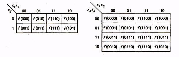 Отличие карт Карно от карт Вейча заключается в способе обозначения строк и столбцов таблицы истинности. Таблица 15 иллюстрирует карты Карно для функций трех и четырех аргументов. Аргументы функции делятся на две группы, комбинации значений аргументов одной группы приписываются столбцам таблицы, комбинации значений аргументов другой группы - строкам таблицы. Столбцы и строки обозначаются комбинациями, соответствующими последовательности чисел в коде Грея (это сделано для того, чтобы склеивающиеся клетки находились рядом). Обозначения столбца и строки, на пересечении которых находится клетка таблицы, образуют набор, значение функции на этом наборе записывается в клетку. Для получения МДНФ функции охватываются областями клетки таблицы, содержащие 1. Как и в случае минимизации с помощью карт Вейча, области должны быть прямоугольной формы и содержать 2k клеток (при целочисленном значении k). Для каждой области составляется набор из двух комбинаций: приписанных столбцам и приписанных строкам, на пересечении которых расположена область. При этом если области соответствуют несколько комбинаций кода Грея, приписанных столбцам или строкам, то при составлении набора области записывается общая часть этих комбинаций, а на месте различающихся разрядов комбинаций ставятся звездочки. Например, для функции, представленной табл. 16, области I будет соответствовать набор 1*00 или член МДНФ