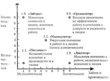 что означает слабое управление и малую степень эмоциональной поддержки. В зависимости от направленности руководителя на интересы дела или на заботу о взаимоотношениях с людьми можно построить «управленческую матрицу» (Р. Блейк, Д. Мутон), выделив пять типов руководителей (рис. 37). А Забота о людях