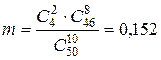 В ящике 50 деталей, из них 4 детали бракованных. Из ящика берут 10 деталей произвольным образом. Найти вероятность того, что среди извлеченных деталей: а) нет бракованных; б) две бракованных детали.