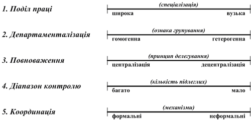 ТЕМА 6. Організація як функція управління Сутність функції організації В процесі вивчення цієї теми важливо усвідомити сутність трьох ключових категорій: "організація", "організаційний процес (діяльність)", "організаційна структура". Вони тісно пов’язані між собою, але не є синонімами. Організація – процес поділу, групування та координації робіт, видів діяльності і ресурсів для досягнення поставлених цілей. Реалізація функції організації здійснюється у процесі організаційної діяльності. Організаційна діяльність – процес усунення керівником невизначеності між людьми щодо роботи або повноважень і створення середовища, придатного для їх спільної діяльності. Основні складові організаційного процесу (організаційної діяльності): а) поділ праці - поділ загальної роботи на окремі складові частини, достатні для виконання окремим працівником відповідно до його кваліфікації та здібностей; б) департаменталізація - групування робіт та видів діяльності у певні блоки (підрозділи: групи, відділи, сектори, цехи, виробництва тощо); в) делегування повноважень - підпорядкування кожного такого підрозділу керівникові, який отримує необхідні повноваження; г) встановлення діапазону контролю - визначення кількості працівників, безпосередньо підлеглих даному менеджерові; д) створення механізмів координації - забезпечення вертикальної та горизонтальної координації робіт та видів діяльності. Організаційний процес – це достатньо складний вид діяльності. Це наочно підтверджує рис. 6. 1, на якому представлено діапазони можливих рішень в межах організаційної діяльності. Кінцевим результатом організаційної діяльності є вибір певної позиції у діапазонах всіх елементів організаційної діяльності. Такий вибір у підсумку і формує організаційну структуру.