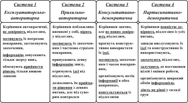 Професор Мічиганського університету Р. Лайкерт дійшов висновку, що організації, які орієнтувалися на бюрократичну модель, менш ефективними. Він запропонував характеризувати організації за допомогою 8 ключових характеристик: