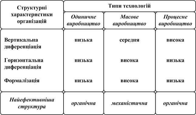 Результати подальших досліджень дозволили зробити такі висновки: 1. Існує тісний зв’язок між типом технології і організаційною структурою. 2. Ефективність діяльності організації залежить від того, наскільки структура фірми відповідає використовуваній технології. Отже, не існує "ідеальної" організаційної структури фірми. Органічний принцип побудови організаційної структури сприяє ефективній роботі організацій, які використовують технології одиничного та процесного виробництва, а бюрократичний (механістичний) принцип підходить для організацій з технологією масового виробництва (табл. 6. 3). Таблиця 6.3 Вплив типу технології на вибір організаційної структури за Дж. Вудворд